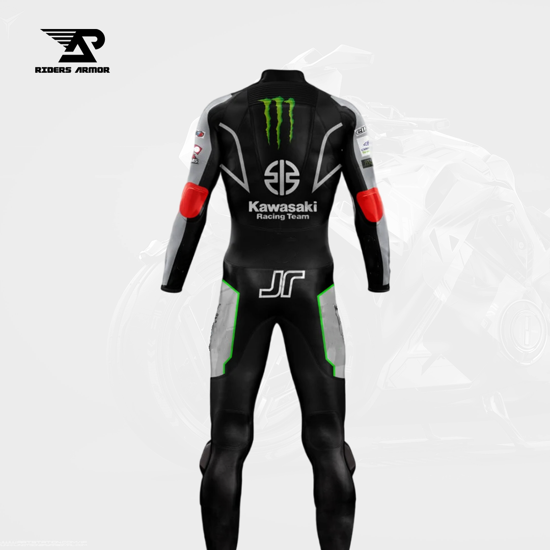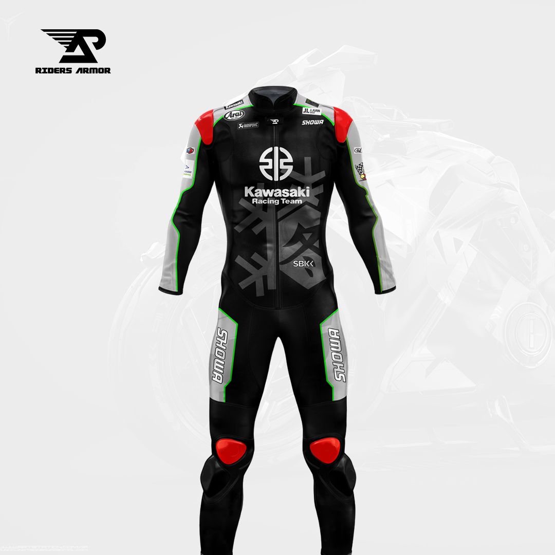 Gear up for the winter with the Jonathan Rea 2023 Winter Test Kawasaki Racing Suit, available at our store! This suit is designed for ultimate performance and style, perfect for any enthusiast. Made from real cowhide leather with a thickness of 1.2-1.3 mm and Samtex S1 Fabric, it ensures complete safety and comfort for the rider. It features certified external protections and Level 2 internal protections, covering sensitive areas like the shoulders, elbows, vertebral column, and knees. Inside, a macro mesh liner provides extra comfort, and all internal protections, including the aerodynamic hump, are easily removable. For additional safety, knee sliders, elbow sliders, and an aerodynamic hump are stitched in with high-strength nylon thread. The suit also includes perforated patches on the front for ventilation, keeping the rider’s body temperature normal.Â