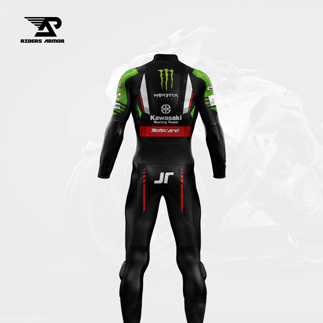 Enjoy the excitement of the racetrack in our Jonathan Rea Kawasaki Pro One-Piece Racing Suit, which is inspired by the 2022 WSBK outfit. This suit is made of entirely real cowhide leather with an average thickness of 1.2 to 1.3mm. It blends style, comfort, and protection.